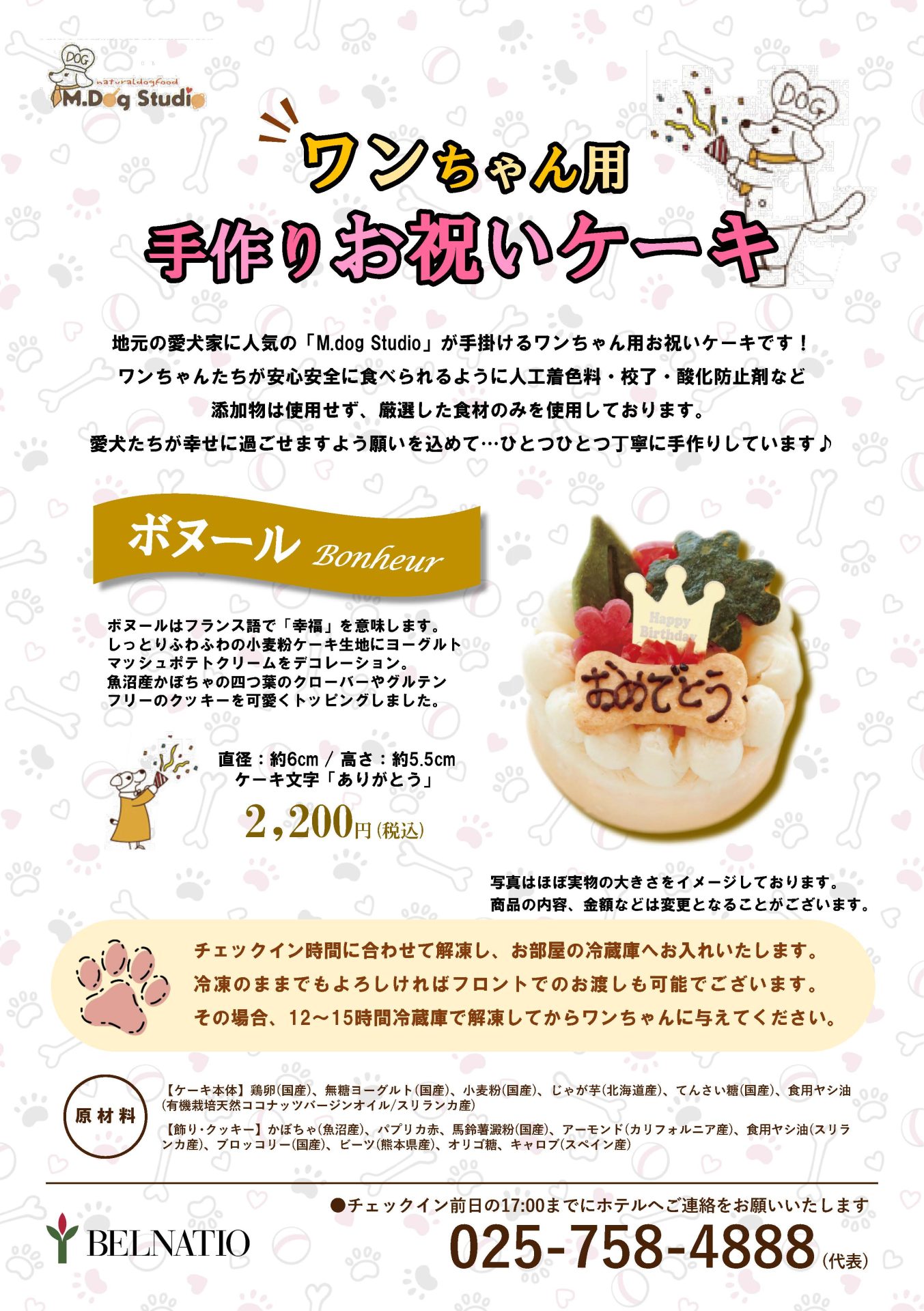 新たにワンちゃん用の手作りお祝いケーキをご用意いたしました! (チラシの内容は変更となることがございます)