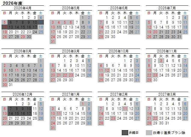 レストラン夕食営業カレンダーは以下からご覧ください。 2026/4/1以降のディナー営業はGW(5/1~5/5)のみオープンいたします。 |